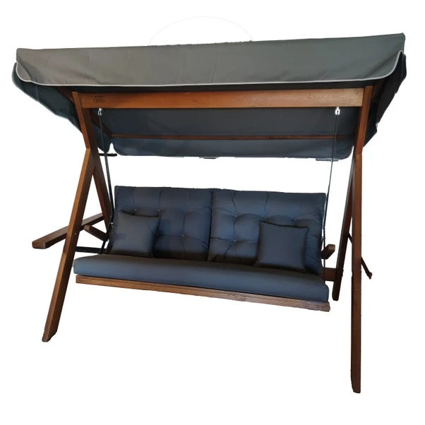This outdoor swing features a durable Iroko wood frame, renowned for its weather resistance. The water-repellant and stain-resistant canopy fabric adds a layer of convenience, while luxuriously comfortable cushions ensure ultimate relaxation. Its generous size comfortably accommodates up to three people, making it a perfect addition to any garden or patio. Regular maintenance, including sanding and applying water-based varnish, will help preserve its beauty.