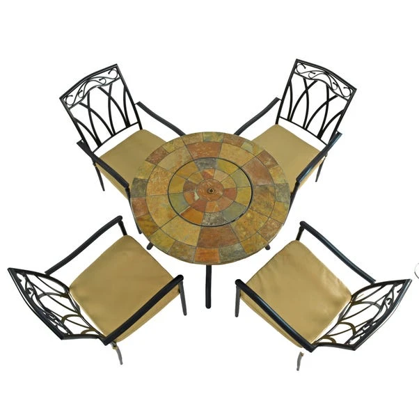 Get ready to cosy up with our Bayfield Firepit 89cm Table with 4 Ascot Chairs Set! This outdoor table set is perfect for any backyard gathering, featuring a natural stone top that doubles as a firepit, so you can enjoy the warmth all year round. The stackable chairs are great for saving space, and they even come with cushions for extra comfort.