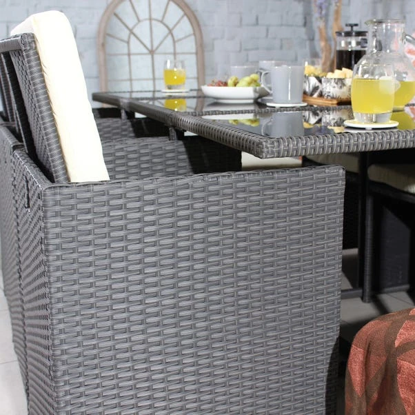 This Cannes 10 Seater Cube Set has a space saving design in a contemporary grey colourway that is perfect for any garden style. Crafted with a steel frame and a glass panel table top, this set is ideal for outdoor dining during the summer months. The footstools can be used as additional seating and the chairs each have folding back rests which provides you with extra comfort when seated.