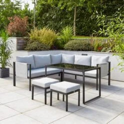 Enhance your outdoor lounge area with this fabulously sleek, conversation set comprising of an upholstered bench, two upholstered chairs and a steel plate table top. This set’s modern and sleek design is perfect for creating a contemporary feel in any garden. Crafted from premium materials, this set is built to withstand life against the elements in any garden.