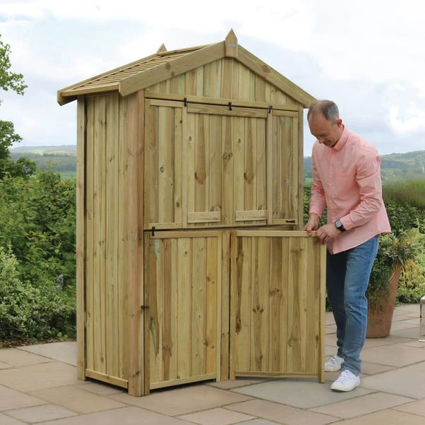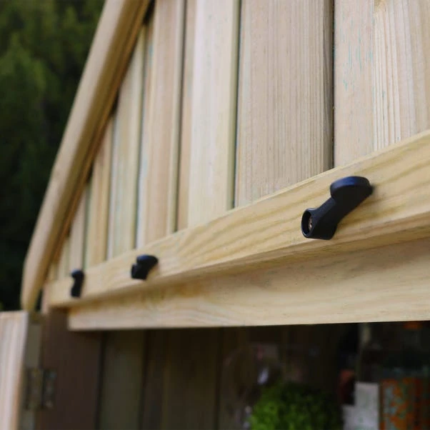 The new Garden bar, is quick and easy to set up by simply opening the two main storage doors to make a sturdy base for the fold down counter which acts as a bar. Opening the side panel hinged doors reveals fully fitted cabinet shelving ready to display a range of drinks and glasses. Guests can sit comfortably at the bar by removing the two sturdy stools which are conveniently stored inside the base section. The two stools are stackable making more room for storage. The innovative design of the compact shape opens up to make a great entertaining space. When not in use, the stools are simply stored away, the bar counter and doors neatly folded back into place and secured with fasteners. Made from sustainable slow grown soft wood from responsibly managed forests and comes with a 10 year guarantee against rot. Comes with am optional black protective cover designed specifically for the Garden Bar set. Made from PVC backed polyester fabric with a central zip and built in cords with cord locks to allow you to fully or partially close the cover around the arbour. The cover is showerproof and has a wipe clean surface.