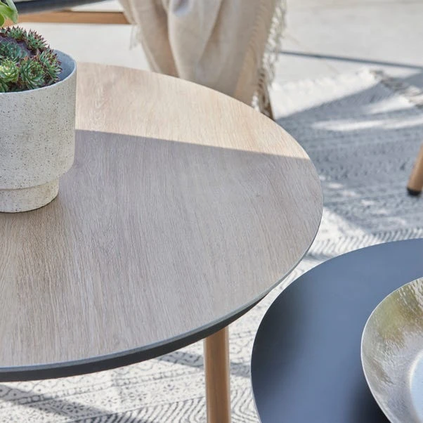 This outdoor lounge set features modern flat wicker detailing and heat transfer wood-effect legs for a stylish, contemporary look. Dual coffee tables with Beech and Black SPC tops offer the natural appeal of wood, along with waterproof, durable, and eco-friendly properties. Dark Stone Grey cushions with ‘easy care’ stain protection and shower resistance provide added comfort and convenience.