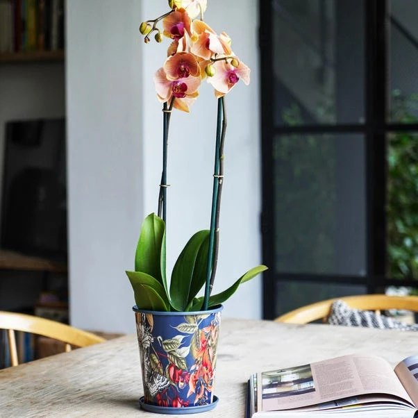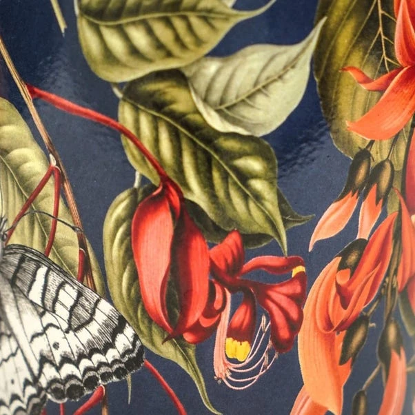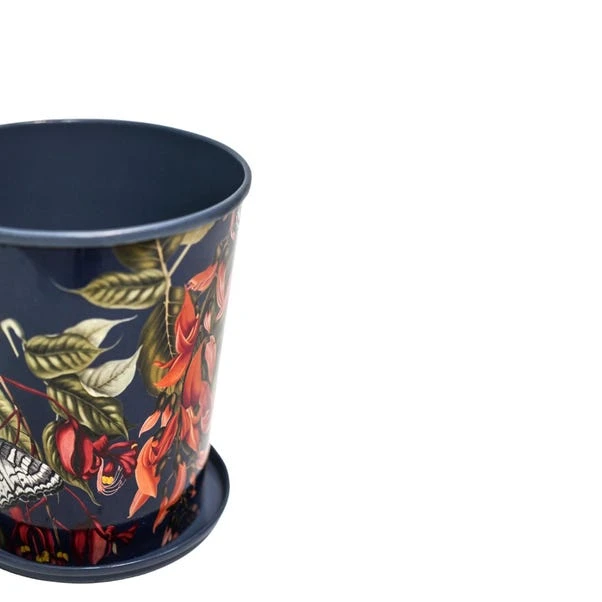 The Kew Temperate House Planter with Saucer, available in two sizes, features a bold botanical design in a moody color palette. Crafted in India, this metal planter set, adorned with archival prints from Kew Gardens, adds a touch of timeless beauty to your space.