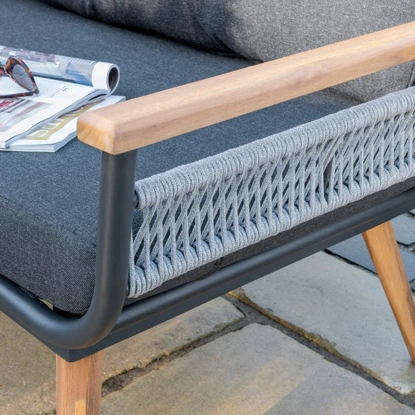 This stylish corner set combines comfort and durability, featuring easy-care dark grey cushions with shower-resistant and stain protection. The powder-coated aluminium frame is lightweight, corrosion-resistant, and modern, while FSC Acacia leg and arm rests highlight sustainability. With two small stools for flexible seating, this set accommodates up to 8 guests, perfect for intimate or larger gatherings. The modern rope detailing enhances its appeal, providing both functionality and elegance for your outdoor space.