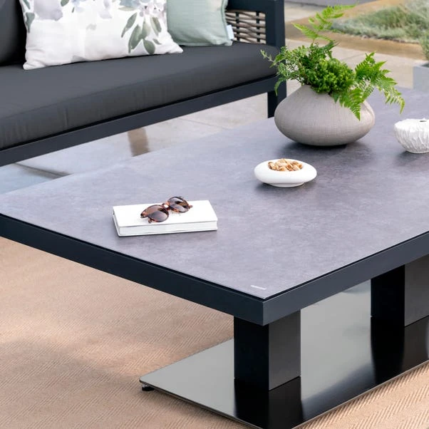 Made with a scratch and rust-resistant frame and UV-treated wicker, this sofa set comfortably seats up to five people. The set includes showerproof cushions for easy care, while the slate grey ceramic-glass top adds a touch of sophistication to your outdoor area. Perfect for lounging in comfort with style.