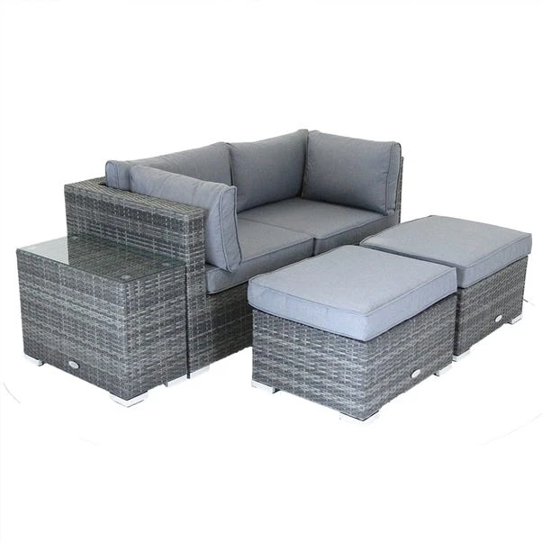 Relax outdoors in luxurious comfort with our contemporary rattan lounge set, perfect for adding a stylish touch to any garden or patio. A perfect set for two to four people, this set comprises of a companion seat, 2 footstools, a coffee table and cushions, for added support.