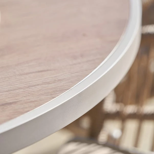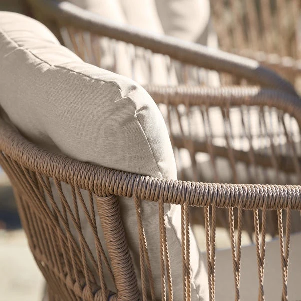 Ideal for large gatherings, the Martic Outdoor 6-Seater Dining Set features a powder-coated aluminium frame, paired with a natural Synthetic Core Weave and Light Putty Olefin cushions for ultimate comfort and durability. The glass table top is finished with an Ash wood effect and has a parasol hole, combining elegance with functionality. The set is resistant to stains, fading, and quick-drying, making it perfect for outdoor dining. For optimal protection, use an Aerocover when not in use. Includes a 3-Year