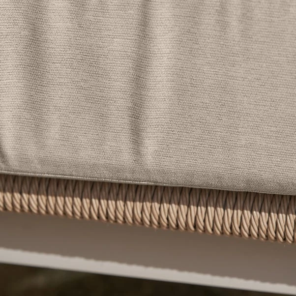 This set includes a 2-Seater Sofa, 2 Armchairs, and a Coffee Table, all crafted from durable powder-coated aluminium in an elegant Latte finish. The frame is enhanced by a Natural Synthetic Core Weave, offering a modern yet organic feel. Plush seat cushions and scatter pillows in Light Putty Olefin fabric provide comfort and durability, with superior resistance to stains, fading, and quick-drying properties. The glass-topped coffee table adds sophistication with an Ash wood-effect finish. Use an Aerocover to maintain its pristine look. The set comes with a 3-Year Structural Guarantee.
