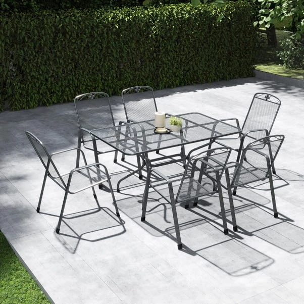 Elevate your garden with the Savoy 6 Seater Rectangular Dining Set. Featuring six dining chairs and a rectangular table, this set combines farmhouse charm with modern functionality. The floral design on the chair backs adds elegance, while the table has a hole for parasol placement. Made from premium steel with a Dark Grey finish, this set is durable and weather-resistant.