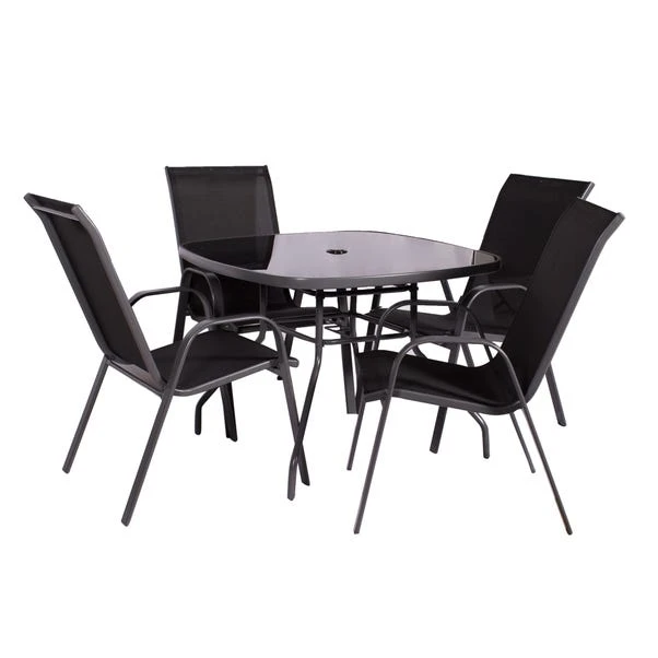 Relax in style this Summer with this beautifully made dining set. Boasting a modern contemporary glass top table, this set will complement any outdoor space beautifully. This set includes 4 stackable chairs, 1 tempered glass table, and a parasol, making it ideal for relaxing outdoors with your friends and family.