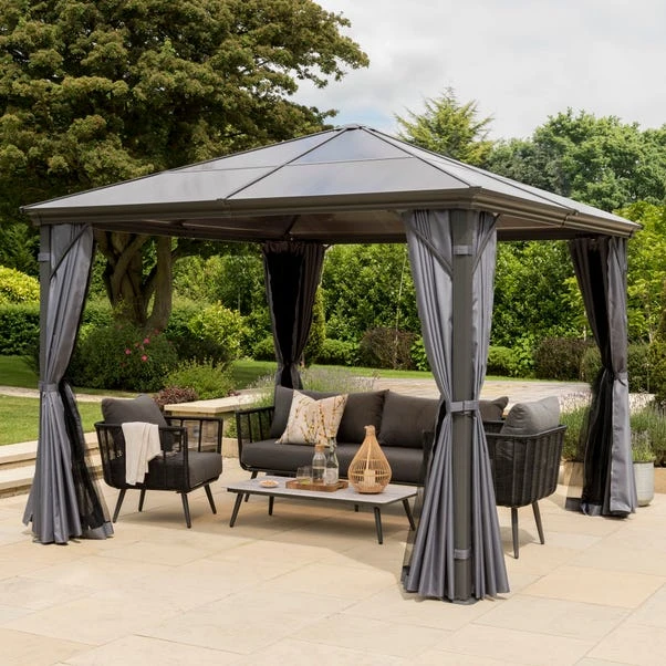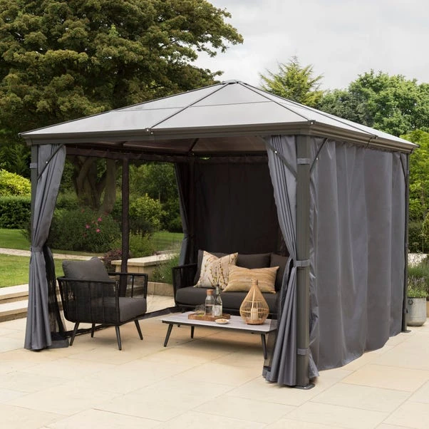Does your outdoor space need some shade? You should pop up this gazebo in your garden for that extra bit of sunlight protection. The roof allows just enough sunlight through, and shelter from rain, so you can enjoy a shaded yet bright summer. Then with included curtains, nets and tie backs, you can create an open plan feel or closed for a cosier experience. This gazebo offers a contemporary finish, with clean modern lines combined with contemporary grey curtains to create a sleek shelter for your patio or decking. Perfect for adding a touch of elegance and functionality to your outdoor space, this gazebo is made from a sturdy aluminium frame and pitched polycarbonate roof. So don’t worry, it is made to last!