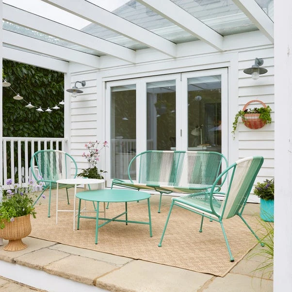 Transform your outdoor space with the versatile Santorini Conversation Set. Featuring one sofa, two chairs, and two coffee tables that can be used separately or combined for a unique visual effect, this 4-seater set boasts a vibrant, contrasting design. Built from weather-resistant rattan and powder-coated steel, it offers both comfort and durability.