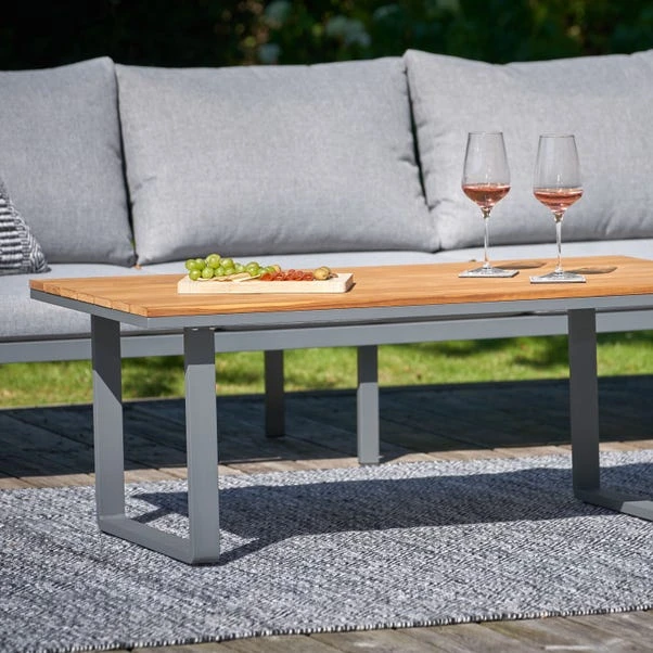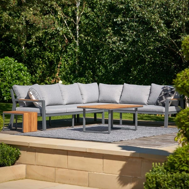 The Stockholm Corner Set comfortably seats up to 8 people, showcasing a teak table top, inlaid teak chair arms, and a powder-coated aluminum framework. With water-resistant cushions and easy assembly, it brings sophistication and convenience to your outdoor gatherings.