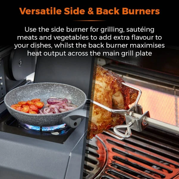 The porcelain enamel coated cast iron grill and precision heat thermometer ensure that you get perfectly cooked food every time, while the glass window lid lets you keep an eye on things without losing any heat. And with six burners, a rear back burner, and a multi-function side burner, you’ll have all the cooking space you need to whip up a feast for your friends and family. The included rotisserie and cover, removable pizza stone, and removable fat collector tray make this BBQ incredibly versatile and easy to clean. And with four caster wheels with brakes, you can easily move it around your patio or backyard.