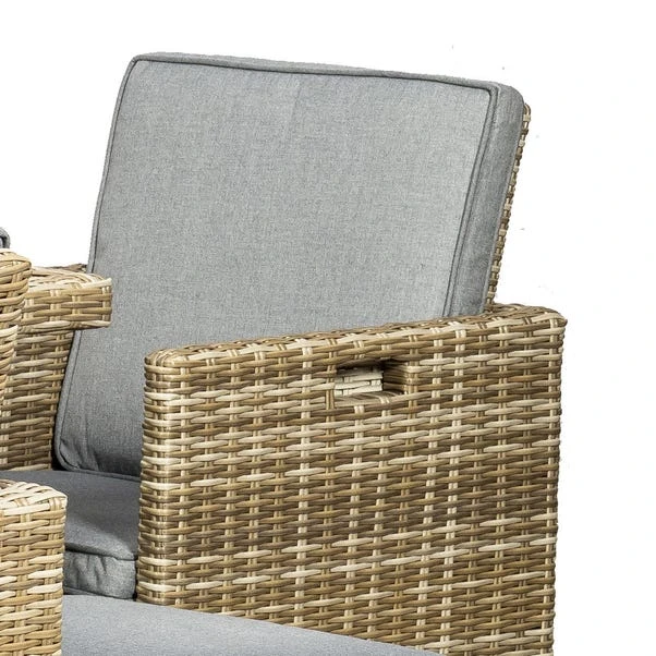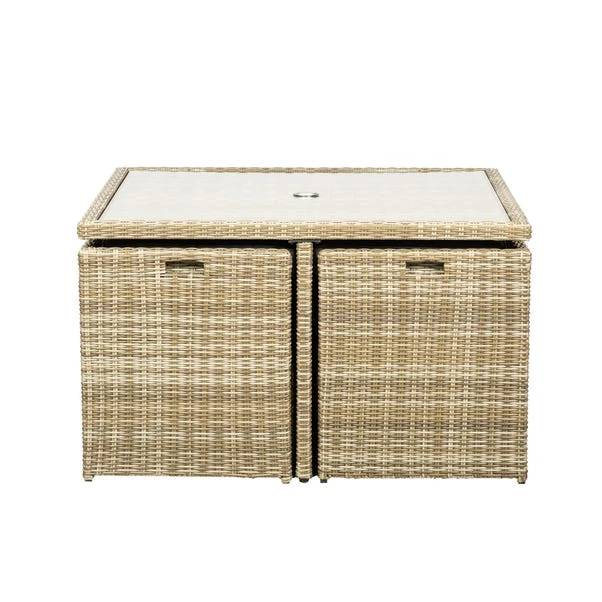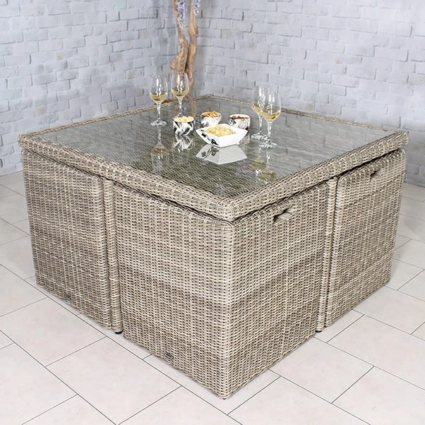Perfect for garden parties and events this dining set with a modern and contemporary design this cube set is perfect for your garden. Featuring tempered safety glass, the chairs and footstools in this cube set can be stored away compacted under the table. This set includes weather shield removable cushions.