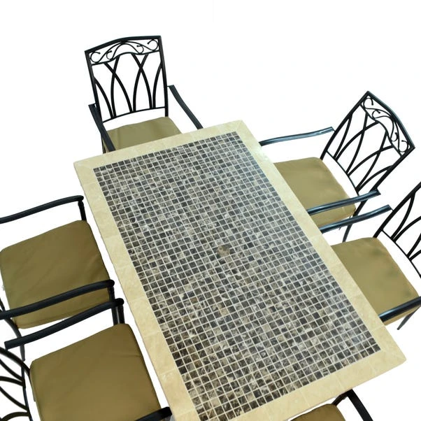 Featuring a classic mosaic design, this Wilmington dining table set will be a great addition to your garden. The Wilmington dining table has a heavy stone table top that has a mosaic design which has been hand laid. The Ascot chairs have been crafted from steel with an elegant backrest design. Full assembly of the set is required.